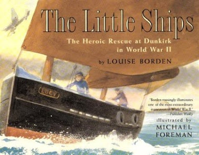 I don't know about you, but I love autographed books, and although I wouldn't probably have gravitated to this book on my own, I'm glad it's now part of my growing collection. The Little Ships is a story of a boy in a fishing town fifty miles from Dunkirk England during WWII. His father and he, along with many other fishermen in their small ships, set sail for Dunkirk to ferry thousands of sailors to the navy ships waiting nearby. In all, 338,226 soldiers both French and English were rescued by the little ships. This amazing feat is brought to life by Louise Borden in a believable manner and the story is given depth with the muted water colors of illustrator Michael Foreman.