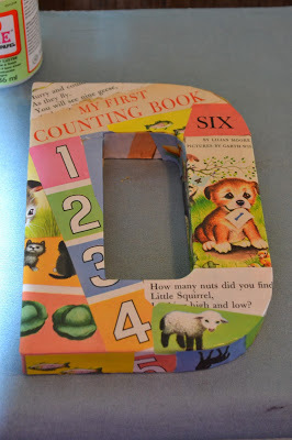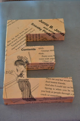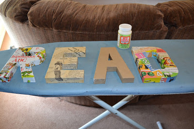 As my basement reno draws closer to being finished, I grow excited. I can't wait to start decorating with all my bookish things like event swag, autographed books, and my letter project. Recently I purchased four letters from my local Jo Ann Fabric store along with some fifty cent books from the thrift store. My objective was to take the letters and cover them in bits of book pages and seal them with modge podge thus creating the word read. I have three of the letters finished, and they are even cuter than I imagined they would be.