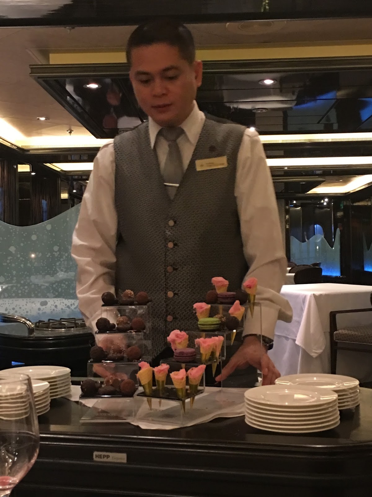 We had some amazing meals on the ship. On the second night we went to the Epicurean with journo friends and were treated to such unexpected delights as a Bloody Mary frozen lolly and a lipstick jelly! Salmon was cut at the table (whisky infused!) crepes were flambed there too. Dinner takes at least two hours and it's fabulous. Not just a meal but an experience. Is it worth the supplement? Oh yes. And not twiddly little nouvelle cuisine portions either. This is serious stuffing.
