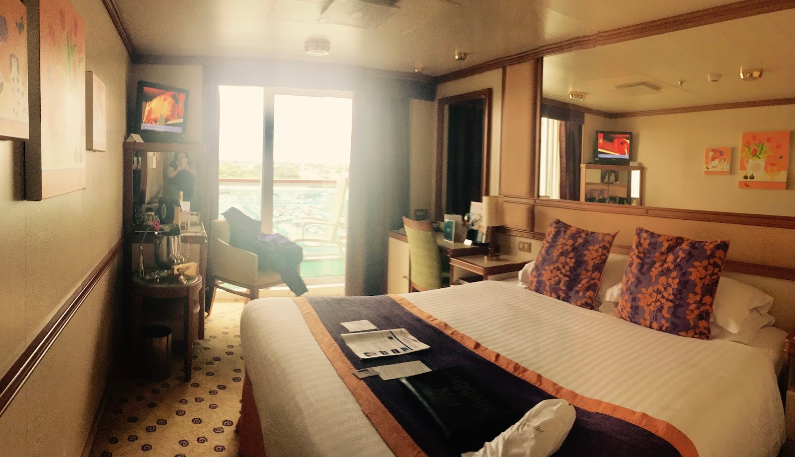 We had a balcony cabin which I would recommend because it's lovely to fall asleep on or just stand there and watch the waves/dolphins/scenery. You don't need to take towels with you or a hairdryer. There is loads of wardrobe space, an ensuite with toiletries, a TV, a safe, mini bar and a huge comfy bed. which is made for you every day - a cabin steward comes in twice a day and leaves chocolates at night. Sadly she doesn't follow you home.