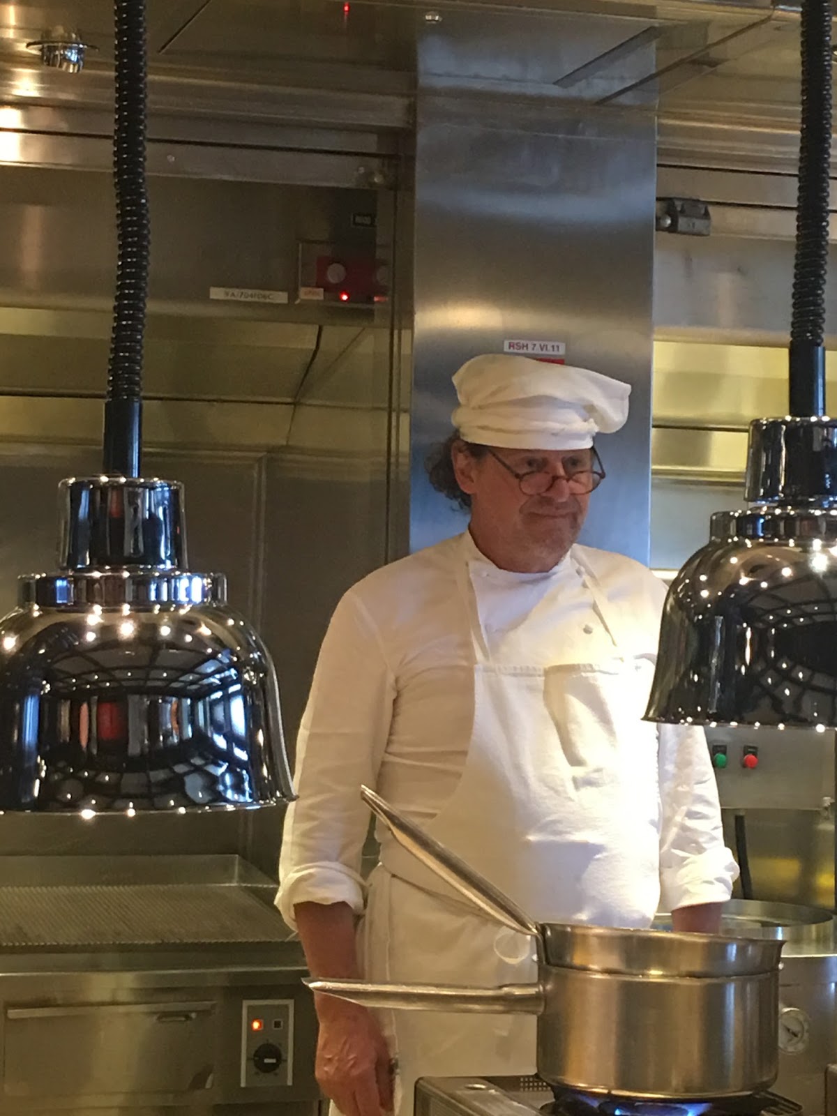 My heart sank when I heard he was cooking seafood. Not my favourite. But I'm not allergic, I don't come out in lumps at the sight of a prawn so I thought I'd put it away to be polite. It's not that hard to stuff down scallops and lobster, two of the fish I can manage to eat without turning green. First he cooked risotto then served it into small plates and we handed them around to each other, washed down with more Prosecco. My sort of cookery lesson. Then came spaghetti with chilli and more lobster and LOADS of basil. Then pasta, tiny macaroni with (barf alert) tarragon. I hate tarragon. I ate tarragon. Have no idea why I could taste the tarragon in that dish but it WORKED and I wolfed it. As for Marco's cooking: fascinating, effortless. Obvs, as my sons would say. We chatted, we ate, we drank. This wasn't a masterclass, well it was, but it was more lunch with Marco with the masterclass happening in the background. And it was fabulous. And at the end of it all, we received a huge coffee table book of his life and pictures which he signed, posed for photos with us and left us very happy - if stuffed - bunnies.
