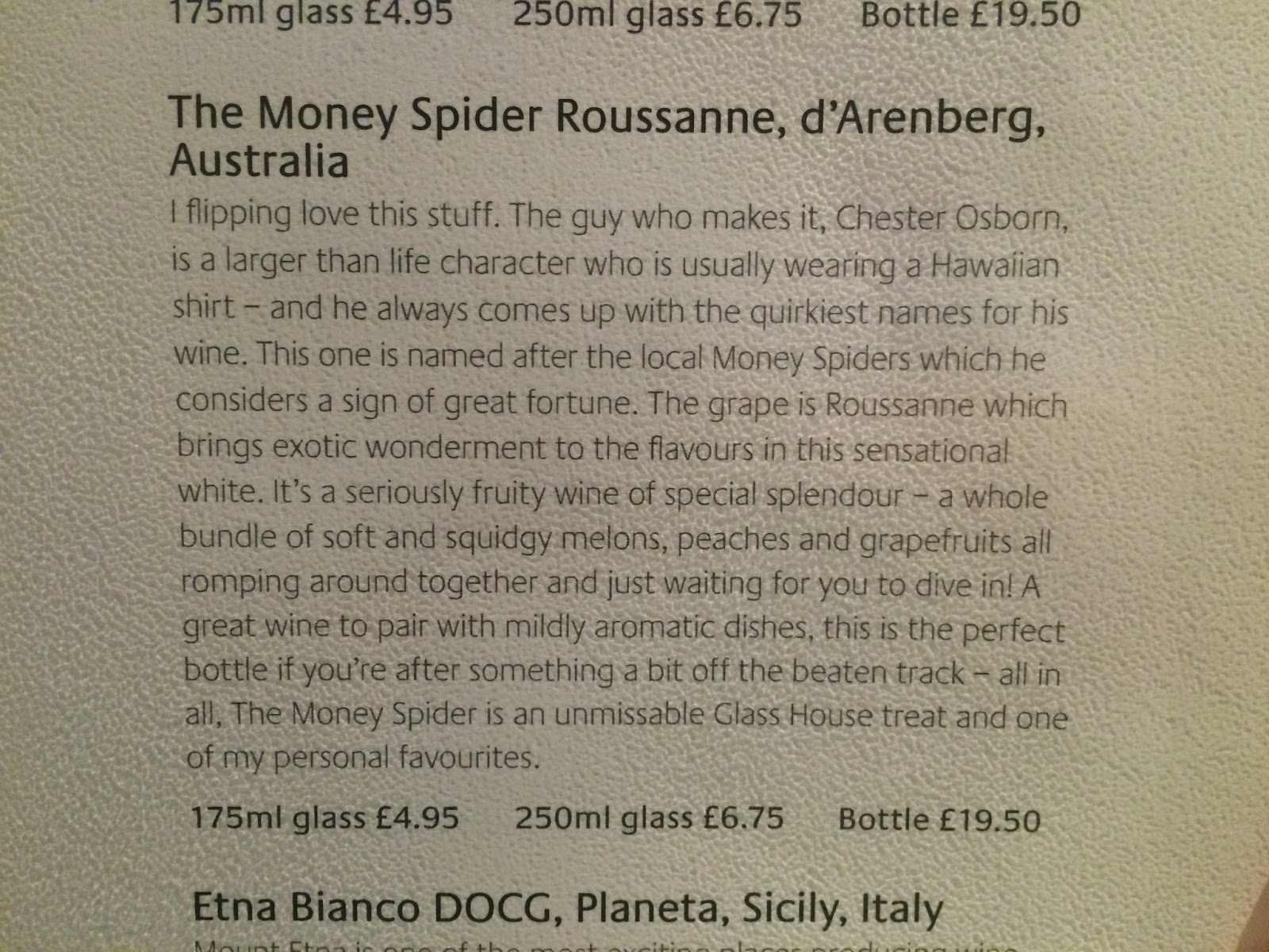 Had a quick Money Spider in the Glass House when we came back. Look how Olly Smith describes things. Don't you just want to dive in? He should write profiles for internet dating, you couldn't resist could you?