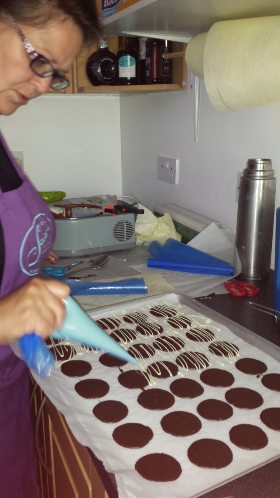 Then we stated on the mint thins, chopping up the fresh garden mint, the senses in my nose were in overload. The mint thins were piped onto trays too, then white chocolate was piped over them when they were set into flat circles (how does she get them all the same size?)