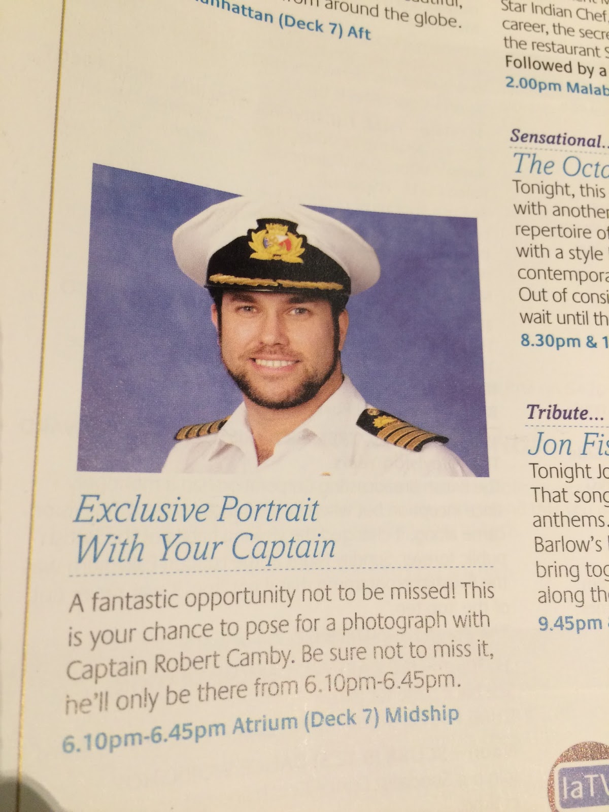 I was on duty book signing - met some lovely lovely people!! Then went off to a posh lunch with the captain. Who is quite a contender for Nigel Ocean-Sea...