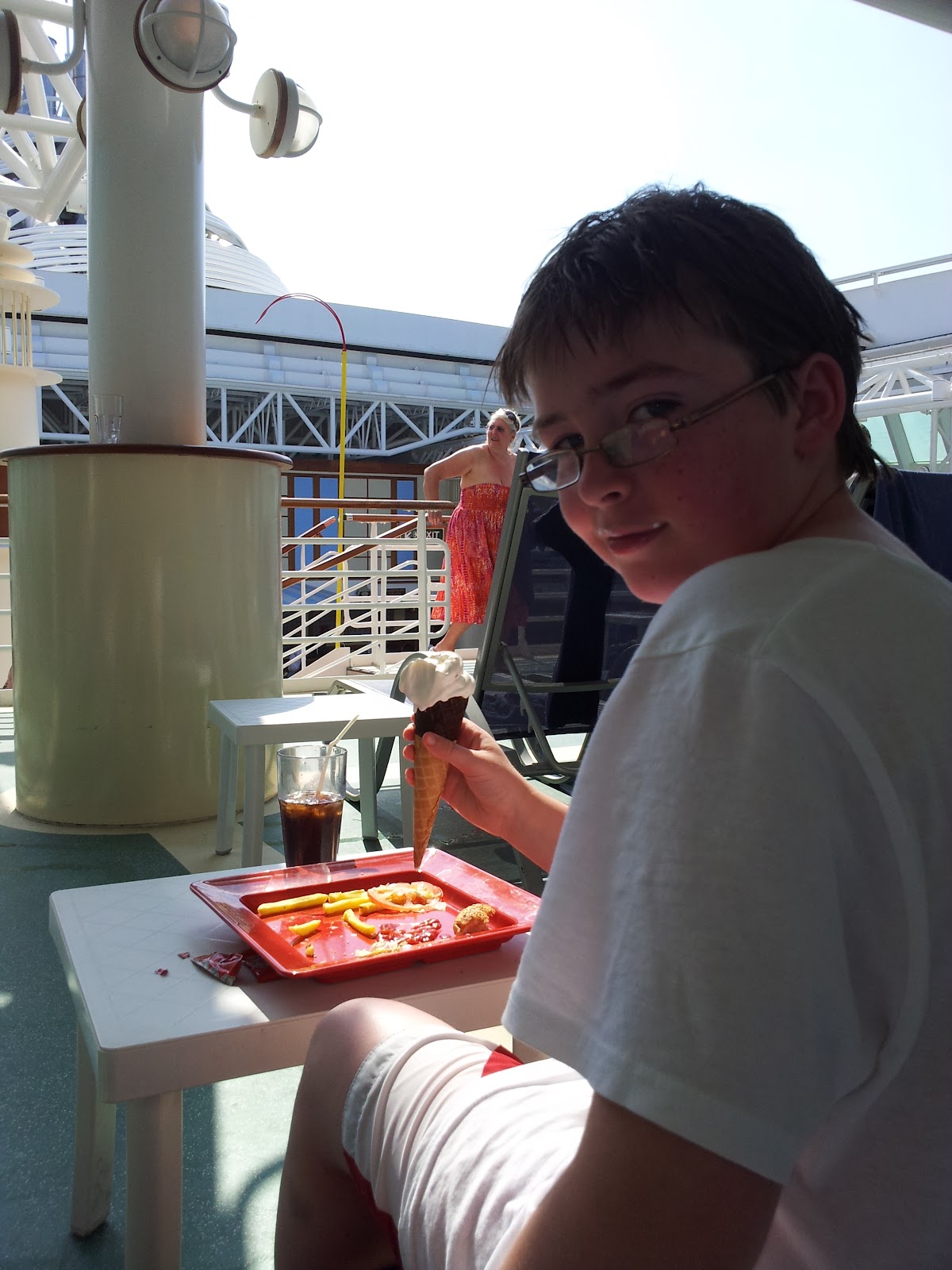 When we get back to the ship, we find some sun-beds and the lads get in the pool and I know that Mr C will love his sea-days more than the port days when he comes back – and he will… because I’ve got him hooked now, like some benign drug-pusher. The lads decide to go off and get a burger from Frankie’s the poolside restaurant – Mr C again whips out his card and again the lads chuckle because it’s free. He can’t believe it that you can just go and get food and not have to pay ( It’s too dangerously wonderful and now he’s back home, I hope he doesn’t try it in Macdonalds).