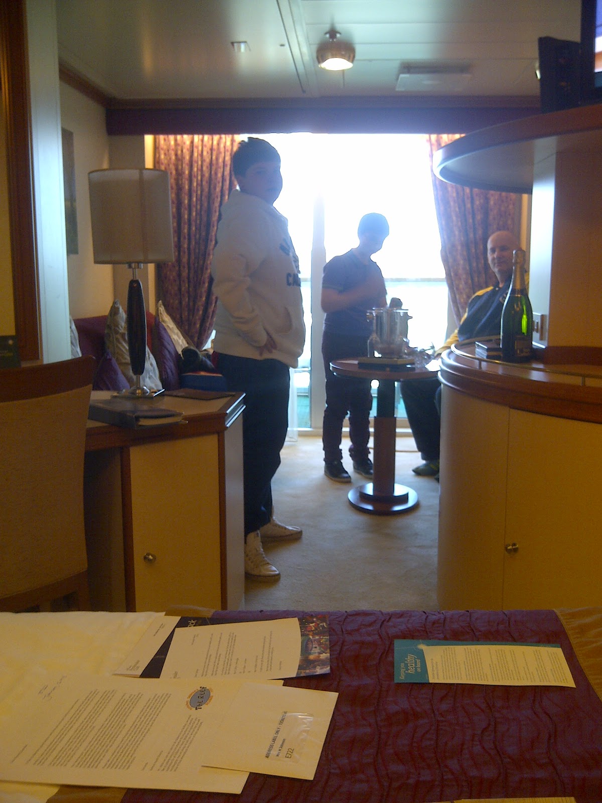 He thinks that we’ll be in hammocks with only a small porthole to see out of. I watch his face as we enter the body of the ship and it’s wearing an expression of ‘wow’. That’s nothing compared to his first sight of the ‘cabin’ – a lovely roomy 4 berth with a living area, two TVs, fridge, large ensuite and a balcony. Ice-wine (oh the nicest beverage in the world) is waiting for us in an ice bucket from my lovely friend Michele – and welcome chocolates for the boys. At least the boys took it that they were for them from the speed they tore into them.