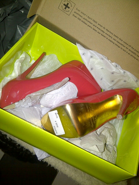 And here they are! Hot orange, impossible to walk on gold-soled shoes which are now sitting on a shrine in my bedroom and worshipped daily.