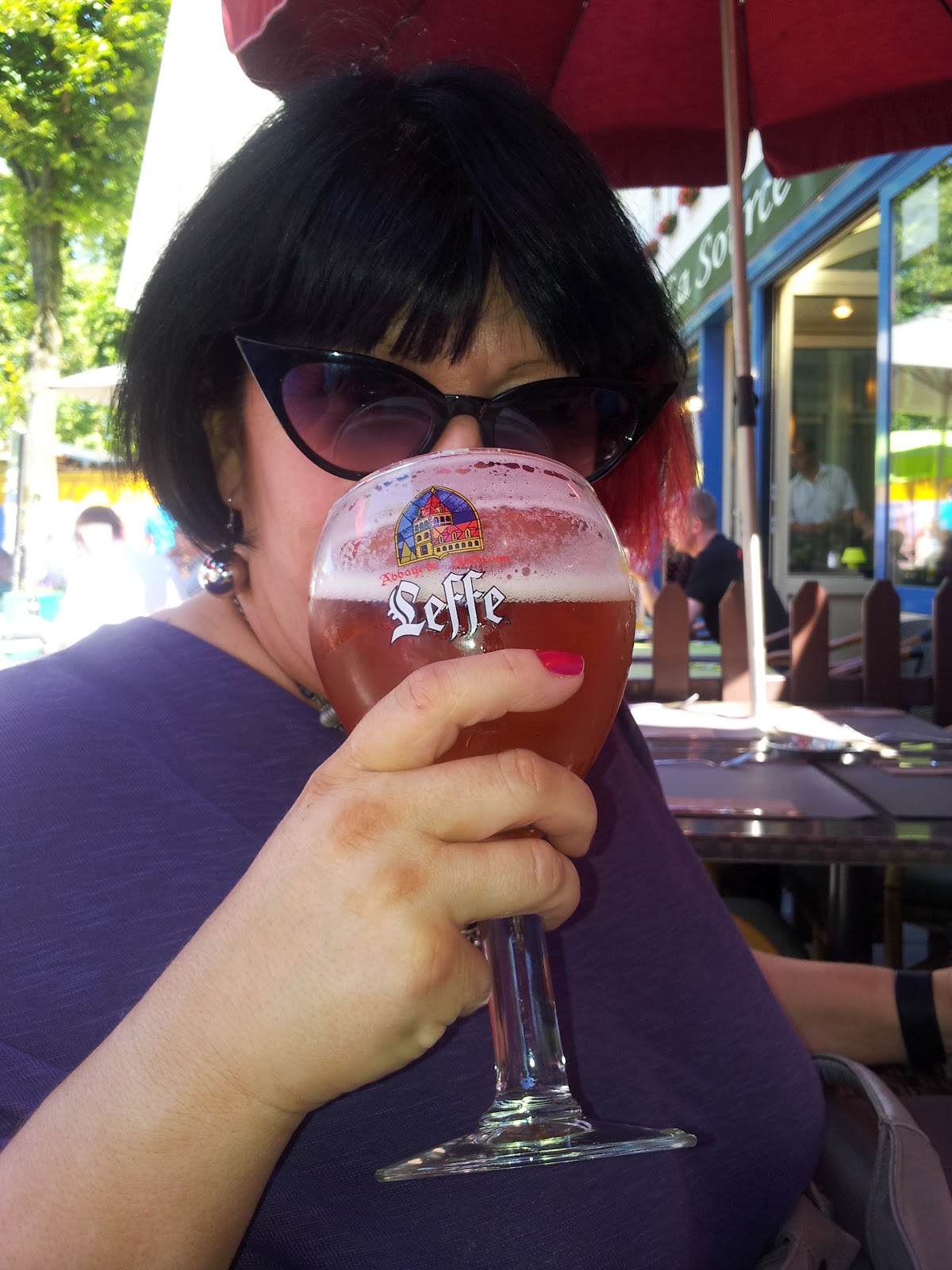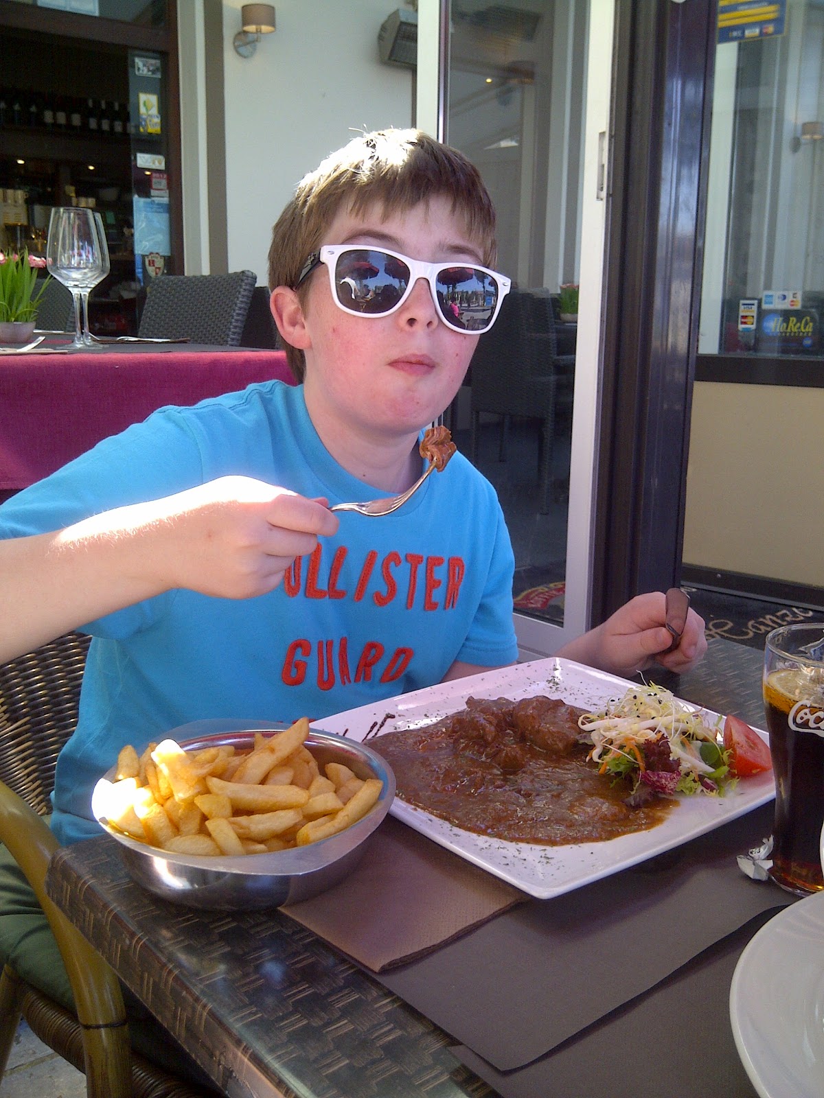 My son picks the best thing on the menu – the local speciality: beef stew cooked in brown beer with ‘frites’ (which always sound so much crunchier and healthier than chips).