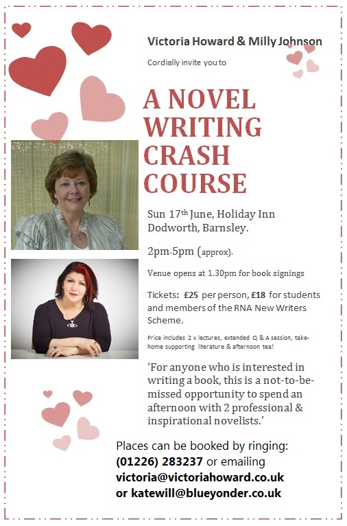 First of all - Victoria Howard and I are running an afternoon 'crash course' in writing a book in Barnsley on Sunday 17th June 2pm -5pmBoth of us will give a presentation, there will be a half-time afternoon tea, plenty of time for Q & As and our latest books will be available to buy.We've both done our course on a few occasions and they've gone down very well, so we're joining forces. Sometimes you just need a kick up the backside to get started - and this is what we hope to give you :)We will also tell you:'From idea to manuscript' - how to develop ideas and characters for your novelHow to make your novel flowHow to plotHow to approach an agentWhat NOT to doThe importance of dialogue The importance of male protagonists in Romantic Suspense Novels ...plus lots more. We intend to send you home with lots of pointers, some supporting literature and being raring to go.The Holiday Inn does wonderful Sunday carveries and pub lunches so if you wanted to make a full afternoon of it - or night - stay for a meal or a drink too.The afternoon will run - approximately - like this1.30pm - arrive early if you want to catch us for an early book sale2pm - I'll be talking for an hour with a powerpoint presentation3.15pm - break for afternoon tea and cakes and a general mingle3.45pm - Victoria Howard will present4.45pm - Q & As 5.00pm - book signingsSo hope you can join us. Places are limited so please book early to avoid disappointment. We won't be issuing tickets but you will be given a booking number.KindestMilly & Victoria