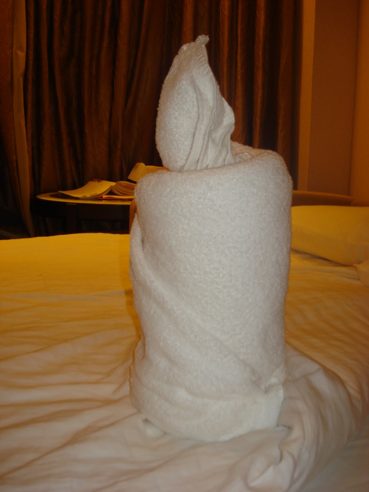 Our lovely cabin steward was called Savio and night after night he made us animals and 'sculptures' out of towels which greeted us when we came back to our cabin at night - here's the candle. I tried to take a picture of the animals, but seeing as he'd used chocolates for eyes, by the time I'd got hold of my camera the kids had blinded them!