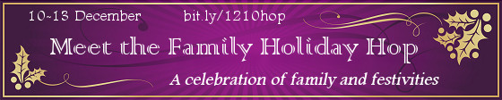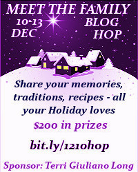 Meet the Family Holiday HopDates: Post any date 10-13 DecemberTheme: Holidays/FestivitiesPost about your favorite family traditions, memories, recipes or favorite holiday reads/musicOr you could post about a fictional family's festive pursuits$200 in prizes: 2x$50/£35 Amazon gift card (open to hoppers), 2x$50/£35 Amazon gift card (open to everyone)Sponsored by Terri Giuliano LongVisit http://bit.ly/1210hop to get more information and sign up