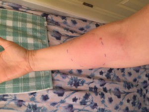 The blue ring shows my right arm several hours after receiving a LDA shot for chemicals, and the redness was even creeping toward the crease in my arm. Contrast that with my left arm, where I received a shot for cats, mildew, and dust. It grew no bigger than a minor bee string. My doctor says this shows just how much chemicals bother me.