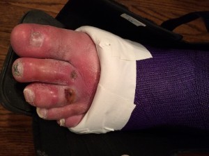 The culprit, quite honestly, was poor medical care at Ruby Memorial Hospital—in the orthopedic and emergency departments; the latter was where we spent 11 hours on Saturday, February 22. Then they sent him home with a foot that looked so much worse an hour after we left that I called the hospital and insisted they recheck the labs and confirm he didn’t have an infection.