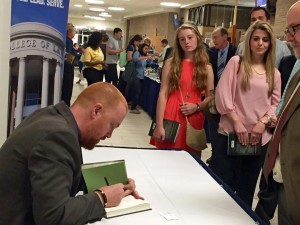 John Temple, a WVU journalism professor, signs copies of his new book, American Pain: How a Young Felon and His Ring of Doctors Unleashed American’s Deadliest Drug Epidemic at his August 31 book launch. [Photo by Benyamin Cohen]