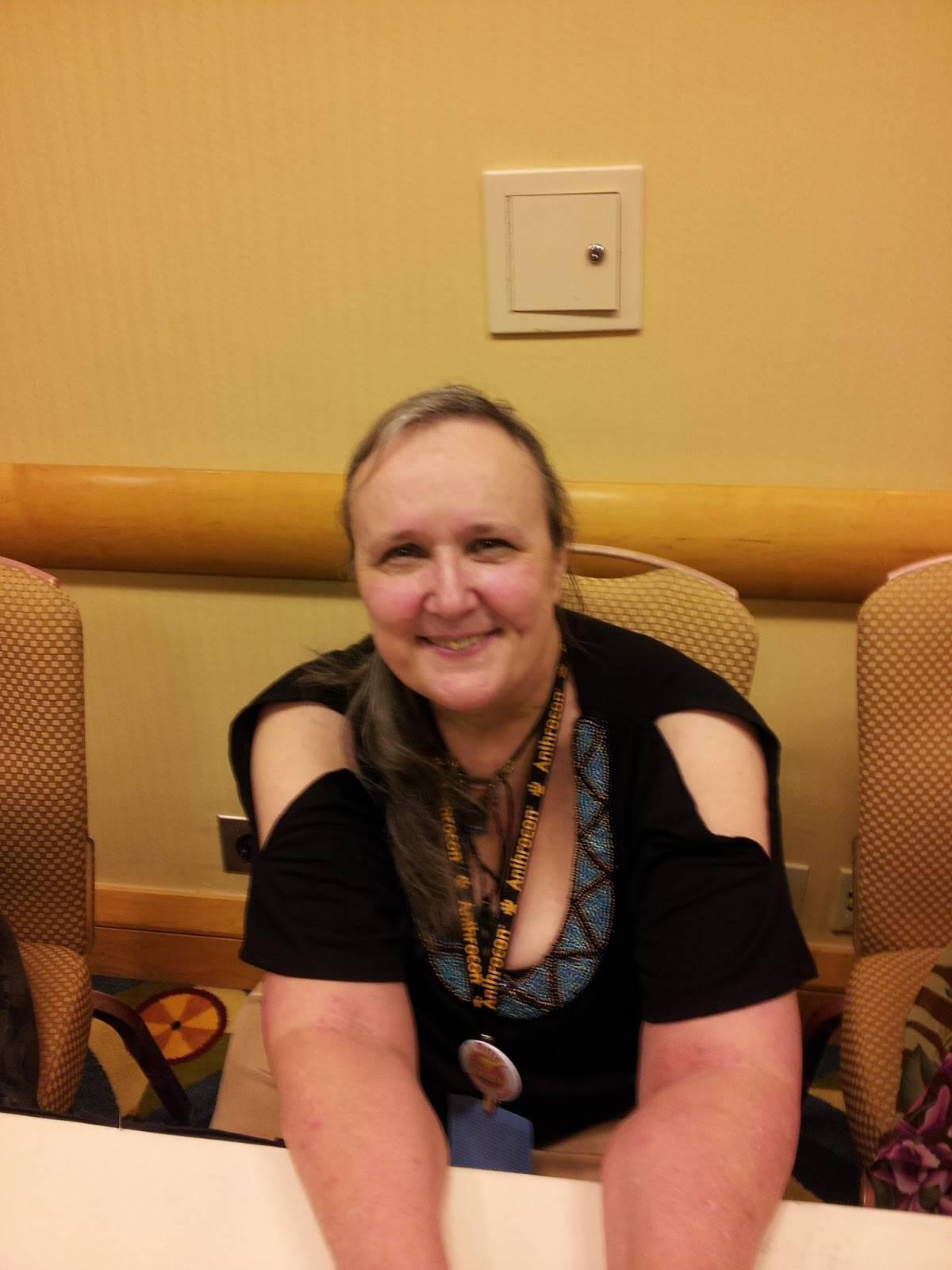 For those who may not recognize this incredible woman, who is also a remarkably prolific author, you now know what Mercedes Lackey looks like at 1 a.m. after a late-ass panel during which I was possibly a bit mouthy. The words "throbbing cock" and "exploding chicken" may or may not have left my lips. Hahaha!