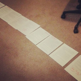 These days, I do most of my writing in yWriter. It's a great program for keeping your scenes and chapters separate and organized. The problem is, when I need to "see" the "flow" of stories it's a little hard to do because they're umm... separate. In this case, the order of the second half of my WIP wasn't making sense to me. So, I printed the scenes out, lined them up and did a little reorganizing and combining. Seeing the scenes all at once really helped and I was able to get the story back on track.
