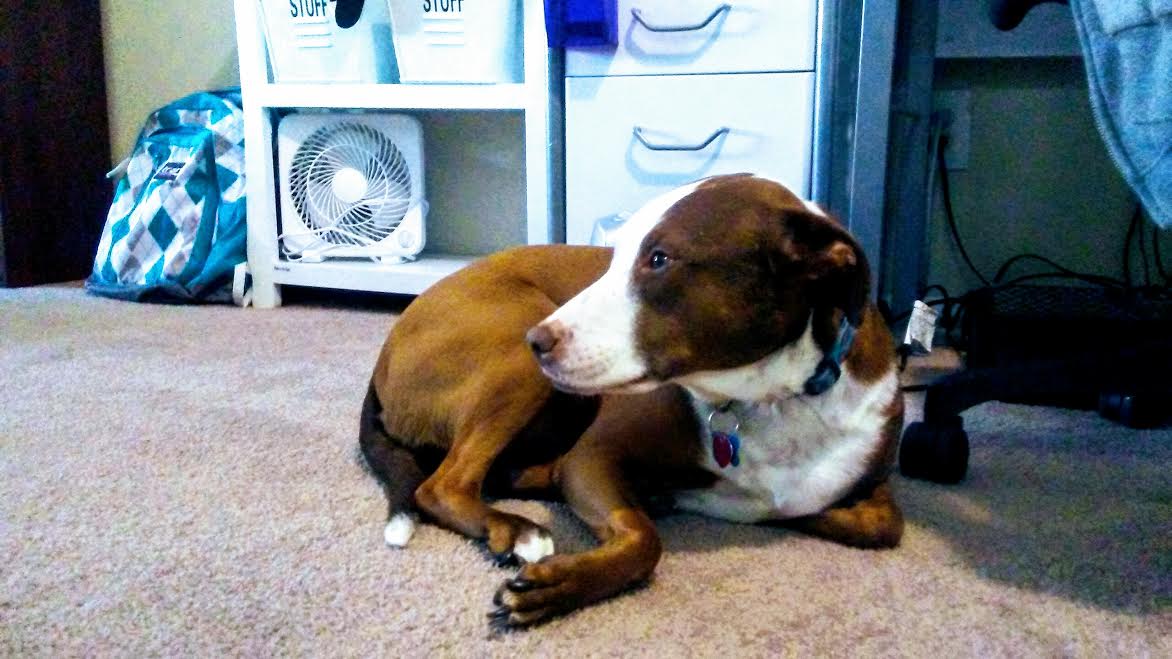 This is Chunky. You can't see it, but there's a little space heater behind her. It's supposed to be for me to stay warm and toasty while writing. But the dogs are always laying in front of it, so I never get any of the warmth for myself. Poor me.