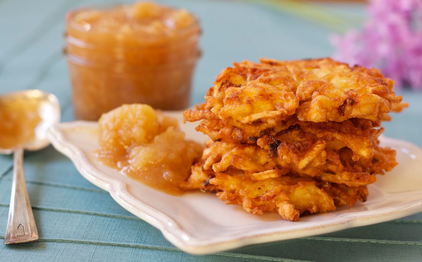Chanukah comes a month or so later and the menu is the same, except for the addition of potato pancakes, or Latkes. So amazingly delicious, I could eat an entire platter myself. My mother used to use a hand grater and yes they were the best, but I use a food processor now and they taste almost as good. The trick is to squeeze out as much liquid from the potatoes before you mix in the eggs, oil and seasonings. That makes for a crispier pancake.