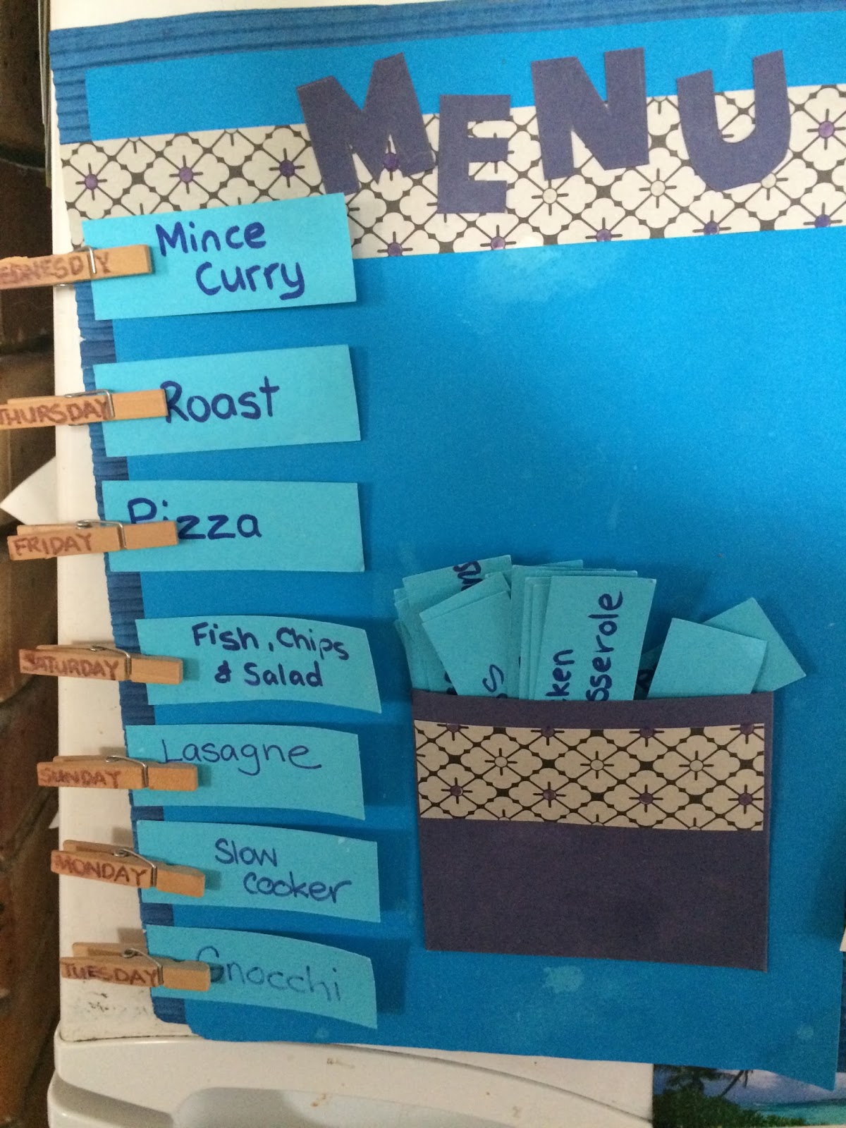 Use a sheet of corrugated card (or for goodness sake – cut out a box!) and decorate it. Left over wrapping paper, pretty pictures from magazines, photos, anything. Just make it pretty. All you really need to buy is some miniature pegs on which you write the days of the week. Then you put a pocket to keep the slips of paper in. On the slips, write your favourite meals. Not the recipe – just the name. For example, I just wrote “Slow Cooker” to remind me what I planned. It could be chicken or soup or lamb, but whatever I wanted for the slow cooker.