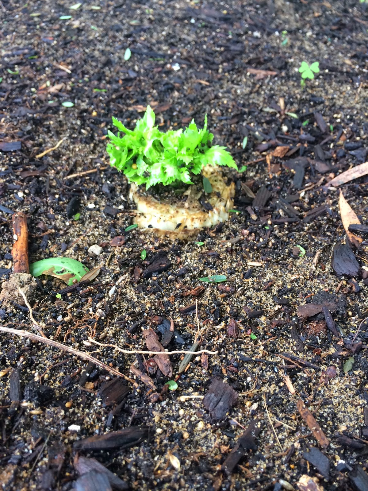 Celery growing from baseAfter your remarkable success with the onions, the next thing to try is celery. It is exactly the same. Buy a whole bunch of celery, cut off the base, and plant it in the soil. The leaves will start sprouting within a week, and you will have celery growing in your pot. Gently break off, or cut off, the leaves and stalks when you need them.You will find that because the leaves are fresh and tender, they are delicious. Use the stalk, leaves and all in stews, soup, stir-fries, salads, anything. Never buy celery again.