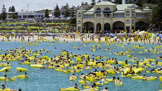Australians celebrate our national day with a lot of fun. It usually involves swimming in some form, cooking meat on an open grill and flying our flag with pride. These days you can find hats, shirts, bikinis, thongs (shoes people - thongs are shoes!!), shorts, sunglasses, earrings and all manner of clothing plastered with the Australian flag (and all made in China). We chuck on the suncream and the zinc cream, and head outdoors, listening to the radio play all our favourite Aussie artists.In my younger days (ie before kids) we would head for the river in Perth. We would stake out our pozzie (slang for position) on the grass and spend the day playing cricket and swimming in the river. At sundown, a fireworks spectacular goes off from barges centred in the river – so we would lie back on our blankets and enjoy.