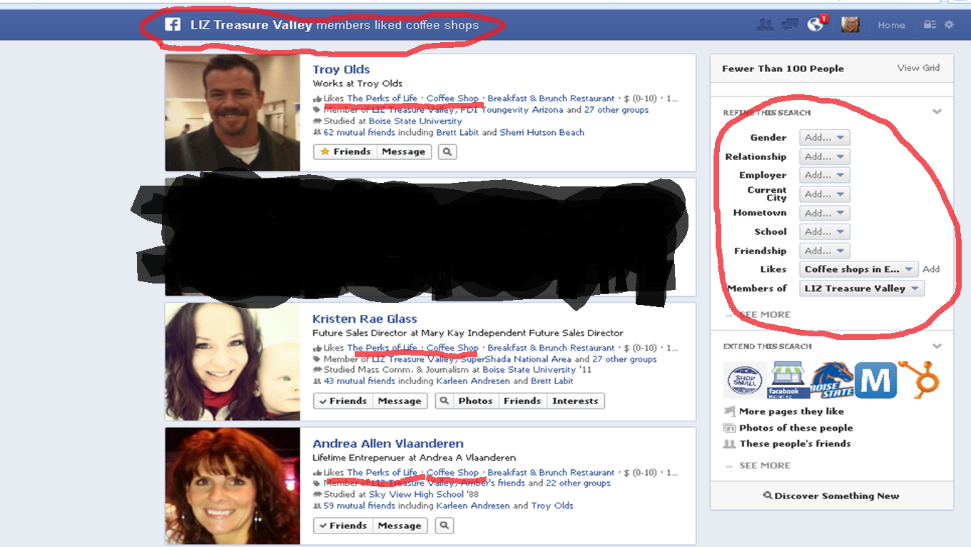 I’ve decided to use a Local Networking Group that I adore called Local Impact Zone as my area I concentrate my search. 1. I searched for “liked coffee shops” within my friends in the LIZ Group. (using search phrases is a great part of this new search)2. Immediately the profiles of my friends popped up and I noticed a pattern in the first few. (You’ll also notice to the side you can control more elements like groups, gender, age etc for the search criteria)3. They each liked “The Perks of Life Coffee Shop” in Eagle. 4. Well I’m near there so why not head on over. My friends like it!(The blacked out area is blacked out for a reason. Don’t ask I’d have to kill ya.)