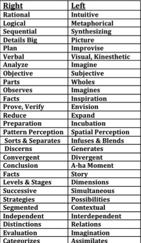 The “left brain” organizes what already exists and thinks linearly. There is a sequential, analytical process toward a specific outcome.