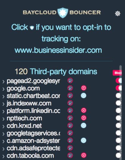 After reading that, I decided to see how many cookies Business Insider actually dropped in my Chrome browser when that story loaded, or at least tried to. Here’s what Baycloud Bouncer reported:
