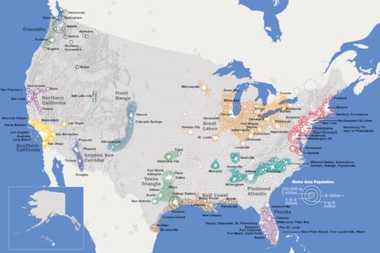 Regions now are defined more by commercial connections. Across those transport “corridors,” forests and farmlands contextualize the cities with wide rural frames. In McLuhan’s terms, the medium sending the message is the countryside flanking transport corridors between the cities. I suspect this is true of all these megaregions, in different ways. Even the highly urbanized Northeast megaregion has lots of wild and open rural areas to unify the cities between them.
