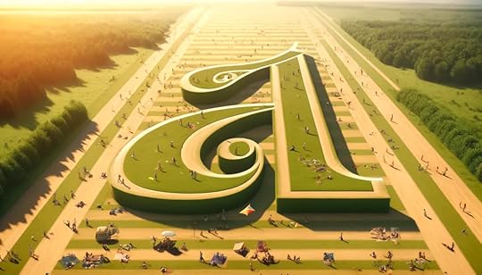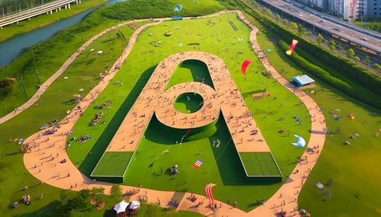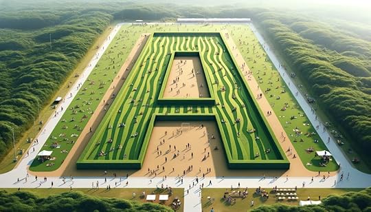 Here’s the updated illustration showing a vast open field creatively landscaped into the shapes of the lowercase letters ‘a’ and ‘i’. The setting is surrounded by people enjoying various activities in a sunny, cheerful atmosphere.