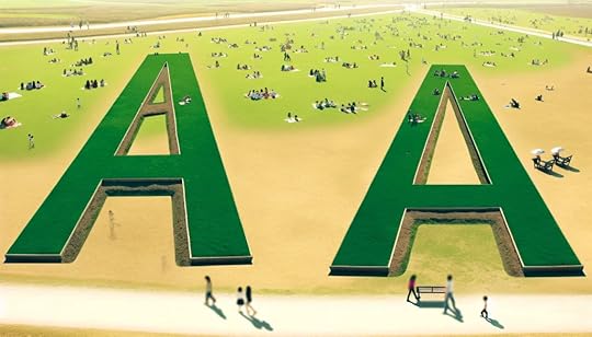 Here’s the updated illustration showing a vast open field creatively landscaped into two distinct uppercase ‘A’ letters, bustling with people enjoying various activities in a sunny, cheerful setting.
