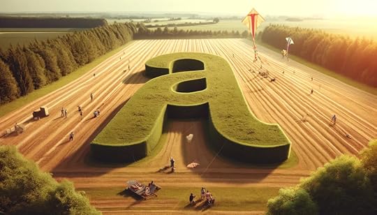 Here’s the updated illustration showing a vast open field in the countryside, creatively landscaped into the shapes of the lowercase letters ‘a’ and ‘i’. The setting is serene and picturesque, surrounded by people enjoying rural activities.