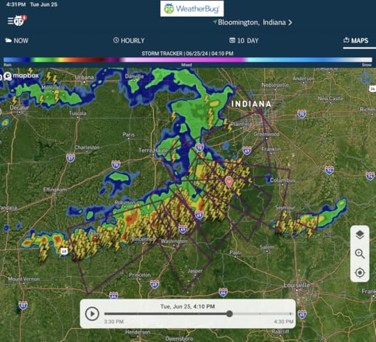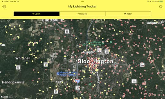 If you’re into this kind of stuff, I recommend the My Lightning Finder app, which produced the above. Also LightningMaps.org on the Web. That one shows thunder as circles expanding at the speed of sound around a lightning dot. Of course, lots of those lightning dots are lines in clouds, or zig-zags between ground and sky. They aren’t all “strikes.”