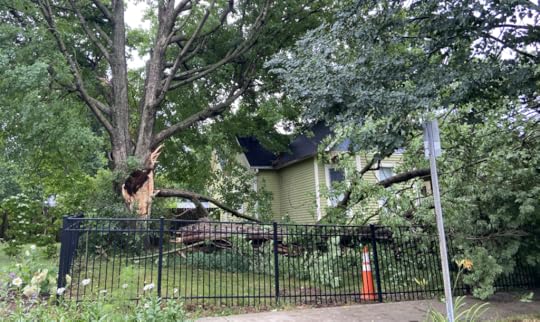 It was a derecho, or something like one. The gust front you see in the third image here looks a lot like the storm front in the image above (via Weatherbug, storm tracker view). I’d experienced one twelve years ago, in Arlington, Mass. It felt like a two minute hurricane, and when it was over, hundreds of trees were down. This wasn’t as bad, but TwitteX seemed to agree that a derecho it was. And we did have many broken trees and power outages. Here’s one example of the former: