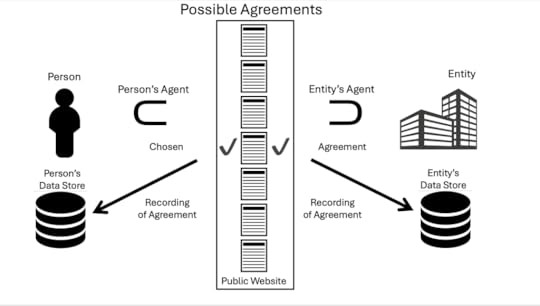 Possible agreements sit at a public website. Customer Commons was created for this purpose, and to do for personal contracts what Creative Commons does for personal copyrights. The person’s agent, such as a browser, acting as the first party, tells the second party (an entity of any kind) what agreement the person has chosen from a small roster of them (again, on the Creative Commons model). The entity either agrees or declines. If the two agree, the decision is recorded identically by both parties. If the entity declines, that decision is also recorded on the person’s side.