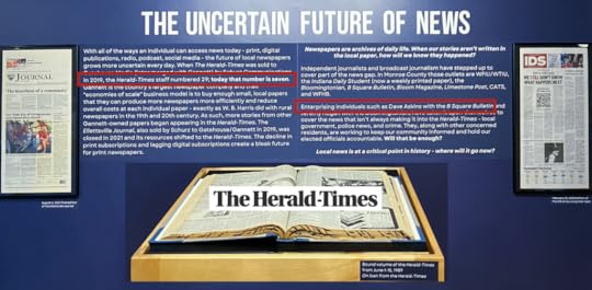 This was in error, because Bloomington did still have a daily paper then: the Herald-Times. And it is still does. The H-T persists in print and online. But, as “Breaking the News: The Past and Uncertain Future of Local Print Journalism” explained last year in a huge and well-curated exhibit at the Monroe County History Center,