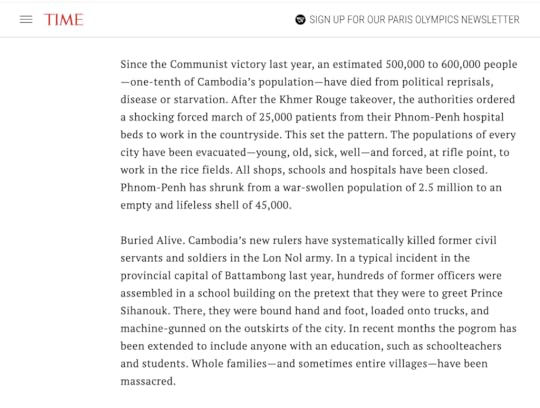 But Time, the weekly news magazine, did cover at least the beginning of the genocide, in the April 19, 1976 issue. (By the way, all hail to Time for its open archives. This is a saving grace I’ll talk about later, and much appreciated.) Here is how that story begins: