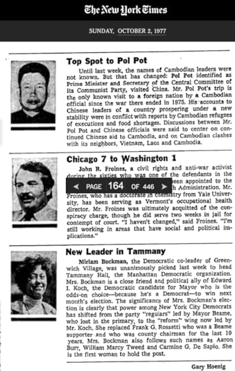 Coverage of Cambodia in the late ’70s remained sparse, considering the death count. Pol Pot didn’t show up in the Times until this was posted on page 164 of 446 in the massive Sunday paper on October 7, 1977: