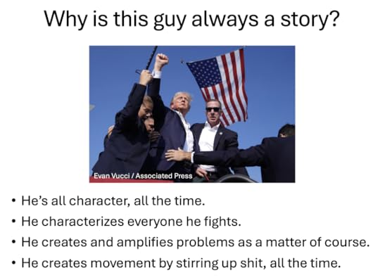 Trump is a genius at all that stuff. And he keeps his ball rolling by making shit up constantly. You’re a lot more free to tell stories—and to move them along—if facts don’t matter to you. Here’s how I put it in Stories vs. Facts: