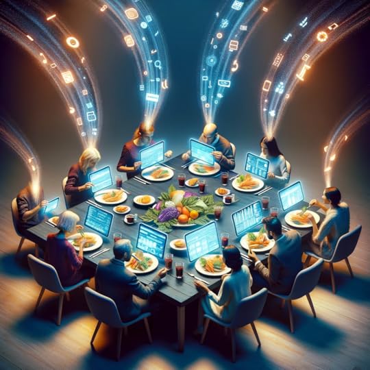 Meanwhile, after failing to get ChatGPT or Copilot | Designer to give me the image I needed on another topic (which I’ll visit here later) I prompted them to give me an image that might speak to a feedroll of blogs. ChatGPT gave me the one above, not in response to “people eating blogs” (my first attempt), but instead to “People eating phone, mobile and computer screens of type.” Microsoft | Designer gave me these: