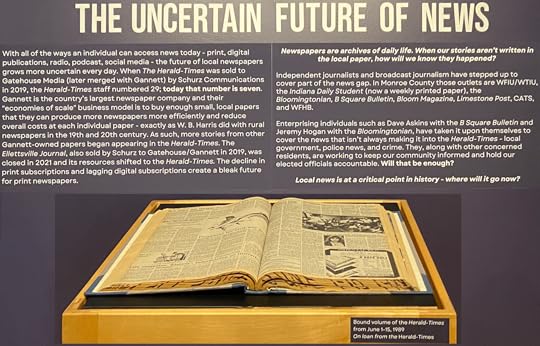 For more than a century, the information center that held a town or a city together was its newspaper. This is no longer the case. Here is how the Monroe Country History Center and the Herald-Times (our local paper) explain the situation in an outstanding exhibit at the Center’s museum called Breaking the News: