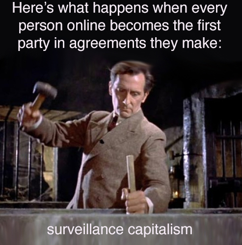 So my case here is not for regulators to play the Peter Cushing role. That job is yours and mine. We just need the weapons—not just to kill surveillance capitalism, but to do all we can to stop AI from making surveillance more pervasive and killproof than ever.