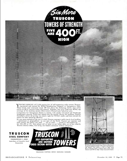 First, an ad in the November 14, 1949 issue of Broadcasting, the Youngstown-based company that built (or supplied steel) for countless AM stations in that band’s golden age. The image is of the array of six 400-foot tall self-supporting towers putting out the directional night signal for WFMJ, now WNIO/1390. HT for scanning and publishing that page goes to David Gleason, who gives us the amazing and valuable [https://worldradiohistory.com/](https...