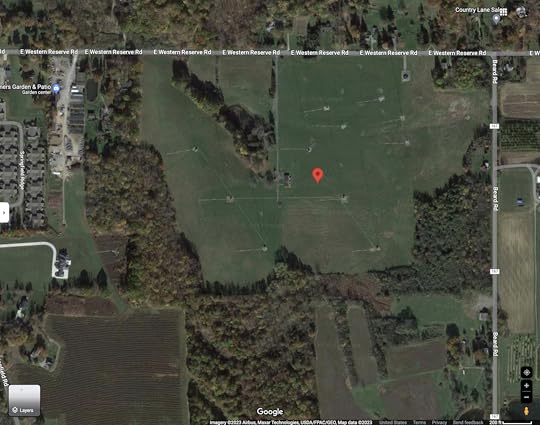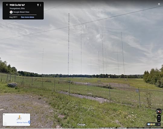 Second is a Google StreetView of what I think is the current view of the same site, with the transmitter shack and the six towers replaced. One of those is also a tower in WKBN’s own directional nighttime array. (Also, in the distance is another tower that appears not to participate in either station’s system.)