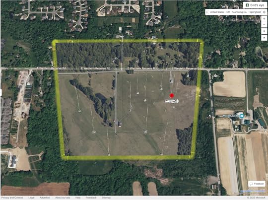 Of possible relevance is that WNIO and WKBN are non-directional by day, the former from a tower at another site in town. Also that WNIO was a 5kw DA-N from the site for most of its life and is now 9.5kw from the day site and 4.8kw from the night site we see in these images—and that its six towers have six different electrical lengths, ranging from 105.8° to 215.1°, apparently in slightly different positions on the ground. Also that WKBN has been 5kw day and night since the late 1940s.