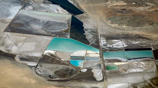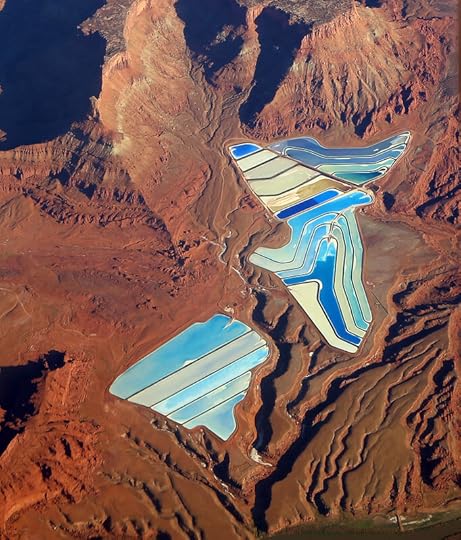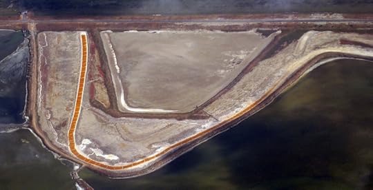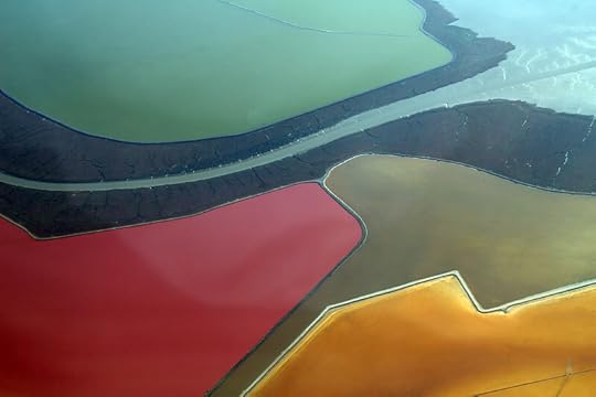 These are salt evaporation ponds on the shores of San Francisco Bay, filled with slowly evaporating salt water impounded within levees in former tidelands. There are many of these ponds surrounding the South Bay.