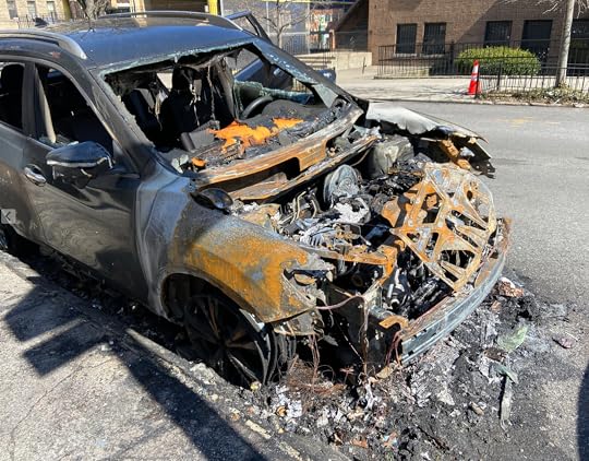 While walking past this scene on my way to the subway in New York last week, I saw that a woman was emptying out what hadn’t burned from this former car. Being a curious extrovert, I paused to ask her about it. The conversation, best I recall: