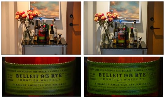 On the top left is a photo taken with my trusty old (also much used and abused) Canon 5D Mark III. On the top right is one taken by a borrowed new Sony a7Riii. Below both are cropped close-ups of detail. The scene is in a room illuminated by incandescent track lighting. It is not an art shot, though it does contain photo art by our good friend Marian Crostic, whose Sony a7R she is kindly remanding to my custody tomorrow. (Her main camera is now an a7Riii like the borrowed one I used here.)