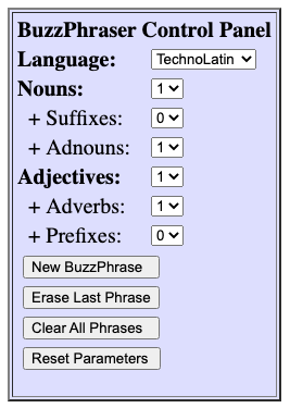 What made BuzzPhraser possible as a product is that the practice of buzzphrasing actually has rules. Like English, TechnoLatin is built around nouns. It has adjectives to modify those nouns. And adverbs to modify the adjectives. It also has a class of nouns that modify other nouns — we call them “adnouns.” And it has a nice assortment of hyphenated prefixes and suffixes (such as “multi-” and “-driven”) that we call “hyphixes.”