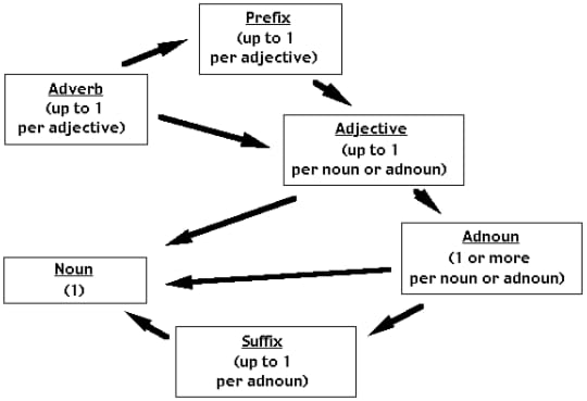adverbs modify adjectivesadjectives modify adnouns, nouns or each otheradnouns modify nouns or other adnounsnouns are modified by adnouns or adjectivesprefixes modify all adjectivessuffixes qualify all adnounsHere is a diagram that shows how the rules work: